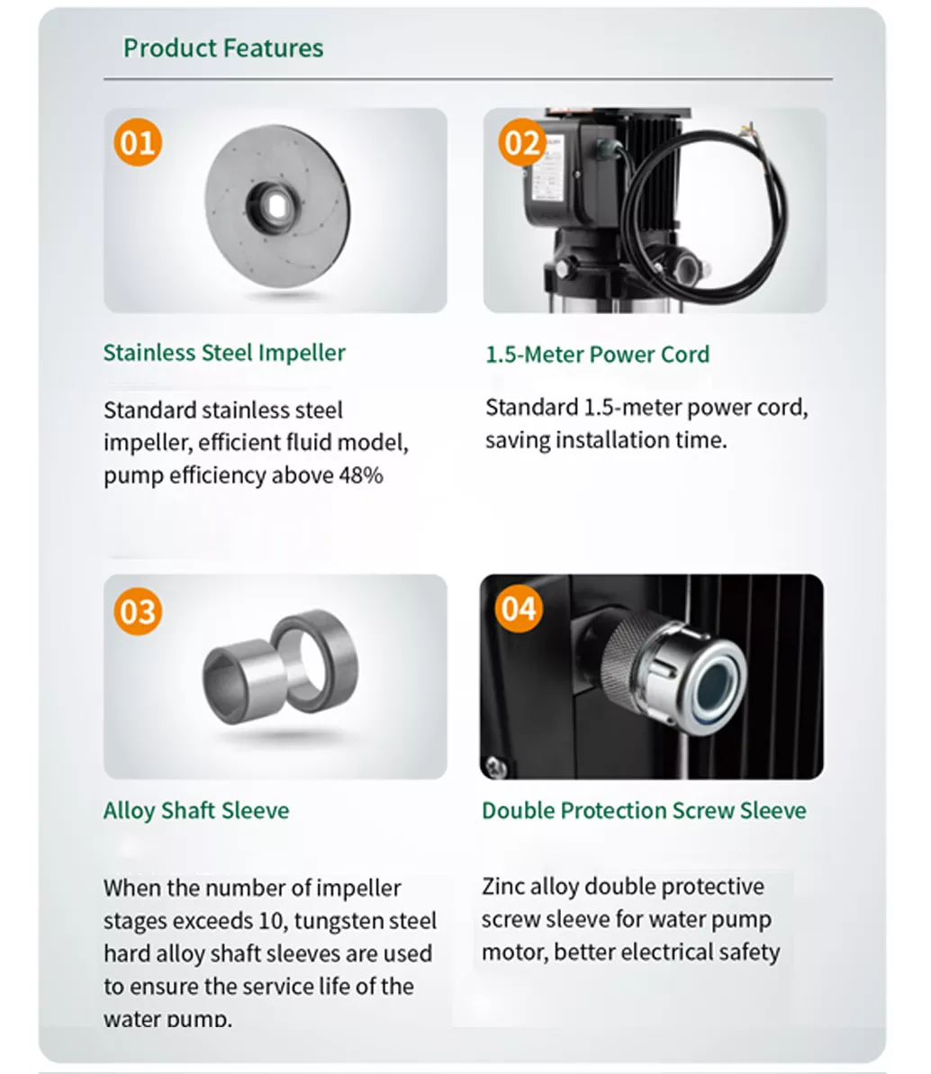 مختلف ضروریات کو پورا کرنے کے لئے امپیلرز کی تعداد کو تبدیل کرکے پمپ ہیڈ کو ایڈجسٹ کیا جاسکتا ہے۔ یہ اسی طرح کی خصوصیات کے ساتھ صاف پانی یا مائعات کے ل suitable موزوں ہے ، جبکہ کچھ ماڈلز کو سنکنرن میڈیا کے لئے اپنی مرضی کے مطابق بنایا جاسکتا ہے۔